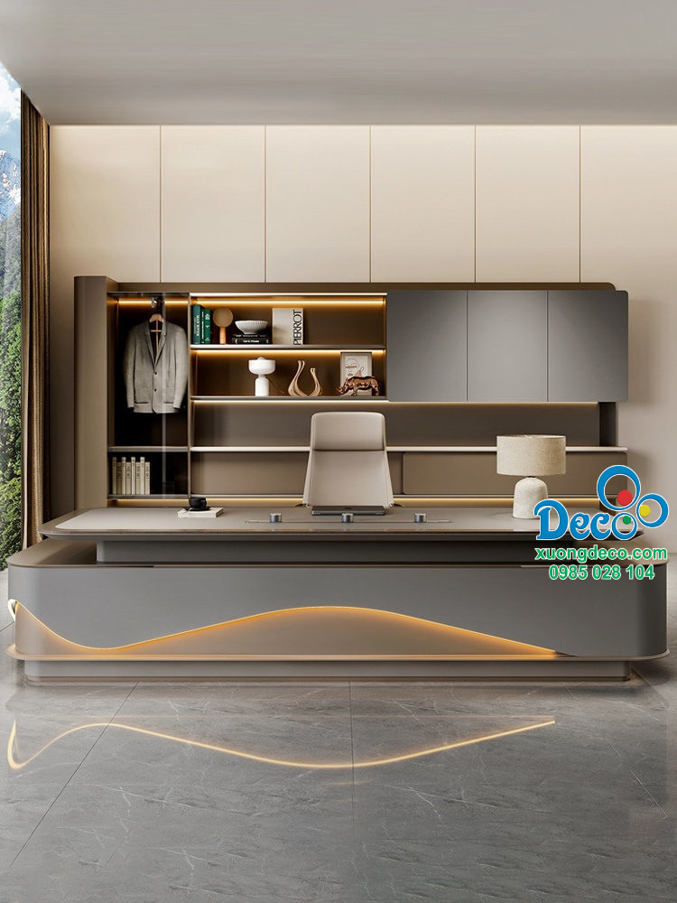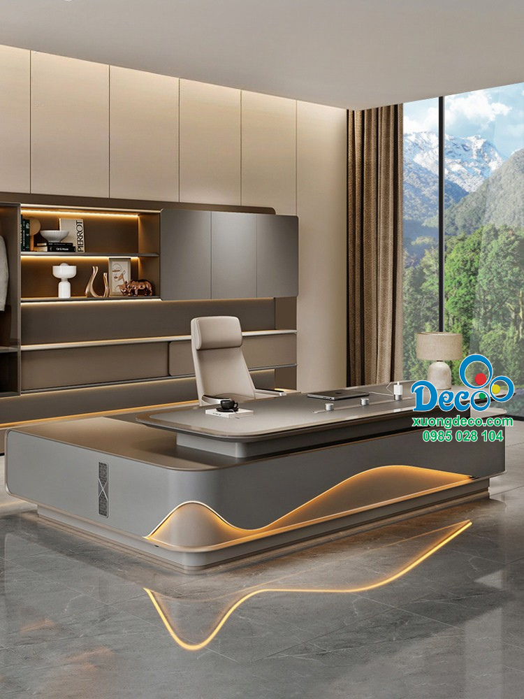 Hệ thống đèn led âm ánh vàng ấm được tích hợp khéo léo chạy dọc theo đường cong yếm bàn, tạo hiệu ứng ánh sáng nổi bật, sang trọng và cực kỳ thu hút. Ánh sáng led không chỉ giúp tôn lên thiết kế bàn mà còn góp phần làm không gian phòng giám đốc trở nên hiện đại, đẳng cấp hơn, đặc biệt vào buổi tối.