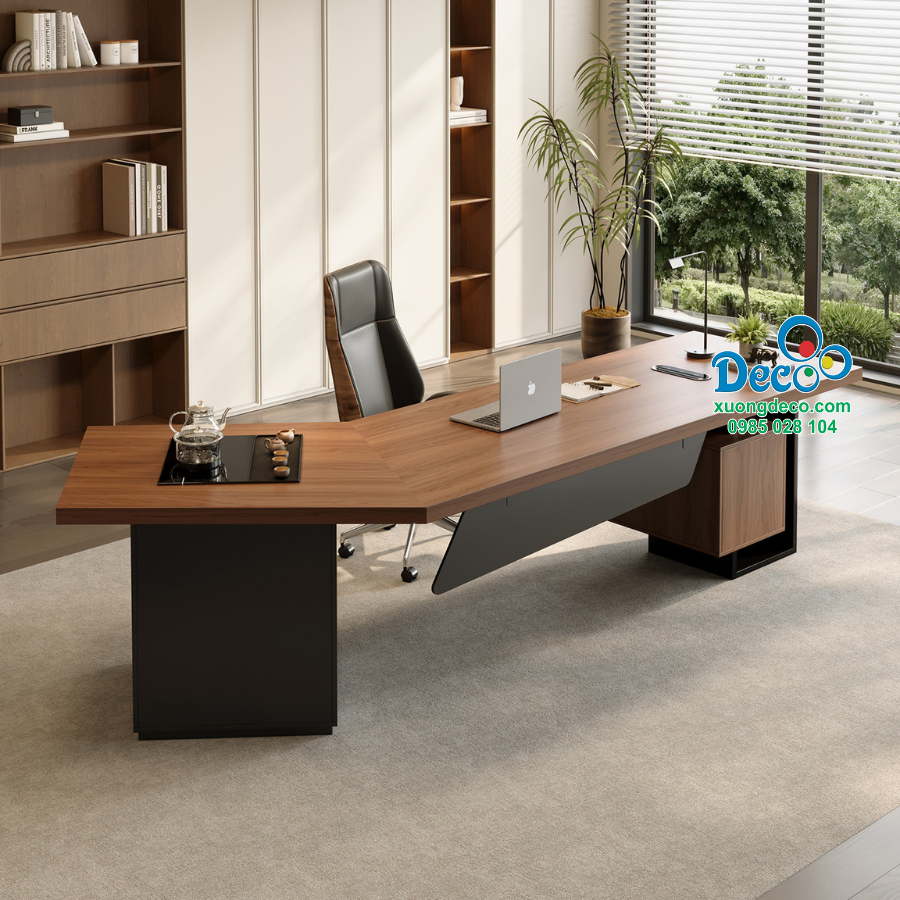 Điểm nổi bật nhất của mẫu bàn lãnh đạo này nằm ở sự phối hợp màu sắc đầy tính thẩm mỹ. Gam nâu gỗ trầm ấm mang lại cảm giác sang trọng, gần gũi và ổn định. Trong khi đó, màu đen mờ ở phần thân và chân bàn lại thể hiện sự mạnh mẽ, quyền lực và phong thái lãnh đạo quyết đoán.