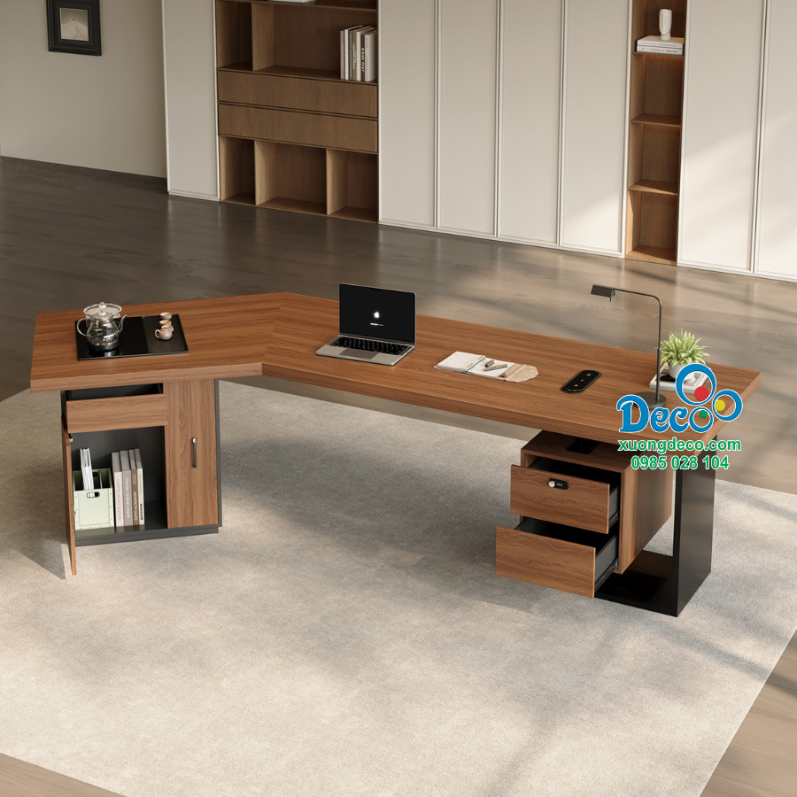 Hai gam màu đối lập nhưng được xử lý khéo léo, giúp tổng thể bàn trở nên hiện đại, không bị nặng nề hay cứng nhắc. Hai gam màu đối lập khi kết hợp lại mang đến một tổng thể hài hòa, giúp bàn giám đốc trở nên nổi bật, hiện đại và đầy quyền lực. Đây là sự lựa chọn màu sắc lý tưởng cho những không gian lãnh đạo đề cao tính chuyên nghiệp và đẳng cấp.