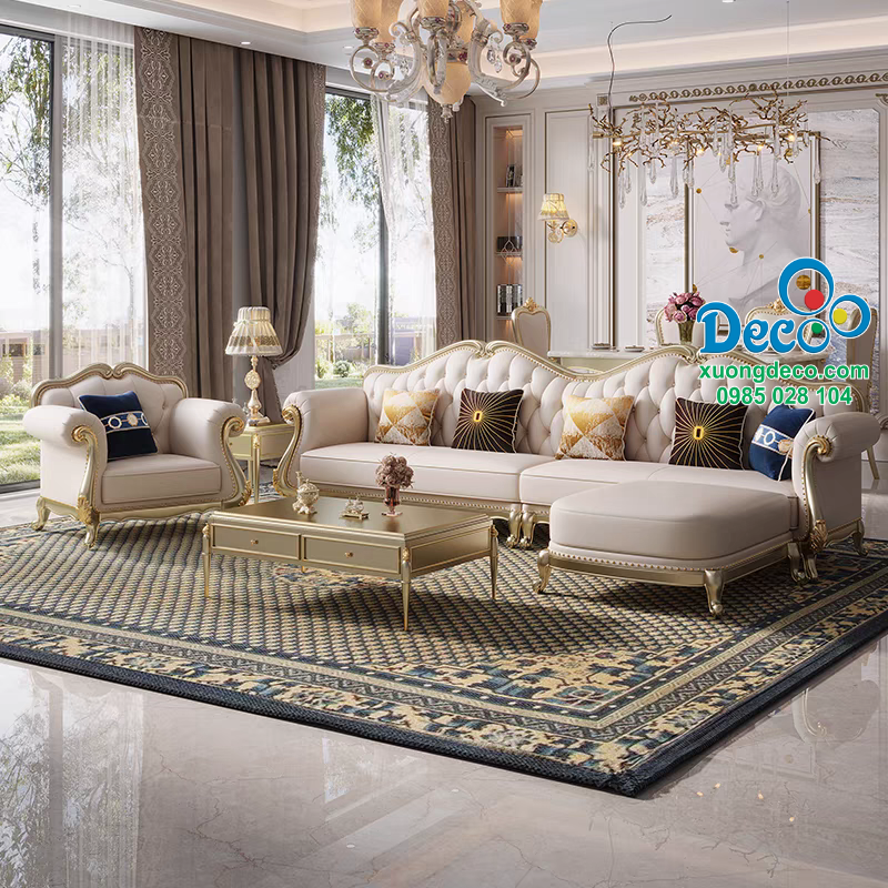 Sofa được điểm nhấn nhá với những chi tiết chạm khắc uốn lượn mang lại một vẻ đẹp trang nhã và tinh tế. Phần chân bàn trà và sofa cũng được trang trí tỉ mỉ với hoa văn uốn lượn đẹp mắt tạo nên sự hoàn hảo. Sự mềm mại của những đường cong và họa tiết chạm khắc giúp tủ trở thành một tác phẩm nghệ thuật đồng thời giúp thể hiện phong cách cá nhân của gia chủ.