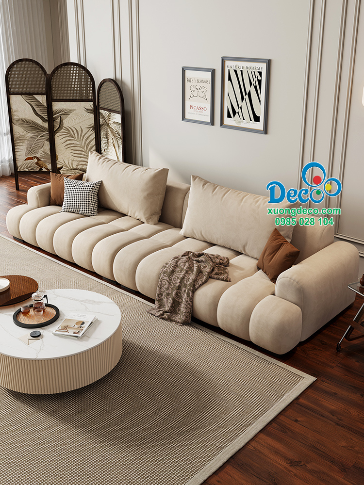 Sofa được thiết kế với tone màu kem, màu kem là gam màu trung tính, nhẹ nhàng. Tone màu này không chỉ giúp tăng thêm sự thanh lịch, mà còn mang lại cảm giác nhẹ nhàng, tinh khiết và ấm áp cho không gian phòng khách.