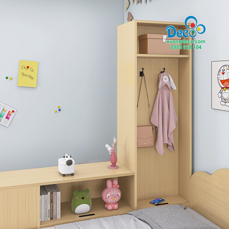 Với thiết kế mở, hộc kệ tạo cảm giác thoáng đãng, dễ vệ sinh và dễ dàng cho bé sử dụng. Đây cũng là nơi lý tưởng để khuyến khích các bé học cách sắp xếp đồ dùng cá nhân, từ đó hình thành thói quen gọn gàng và tự lập từ nhỏ.