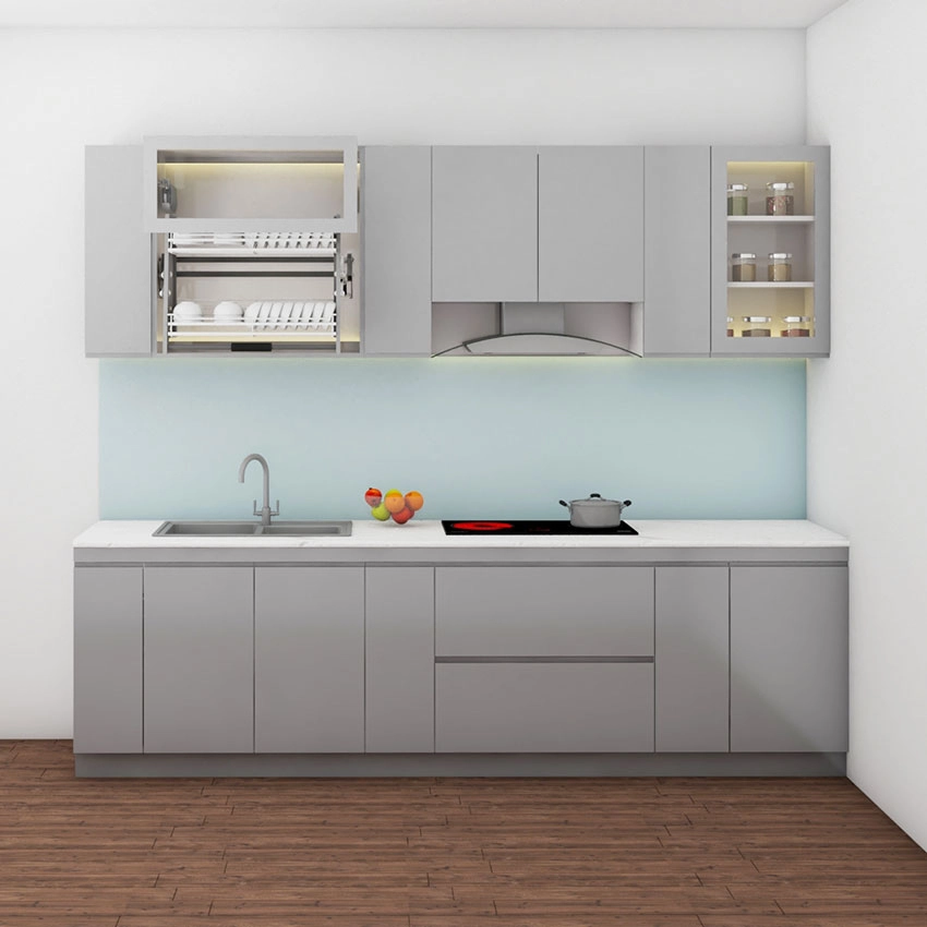 Tủ bếp được thiết kế với tone màu ghi nhạt mang lại không gian hiện đại sang trọng cho không gian phòng bếp. Ngoài ra, tone màu ghi nhạt còn giúp dễ dàng vệ sinh và luôn giữ được sự sạch sẽ, sáng bóng cho căn bếp. Sự kết hợp giữa tính thẩm mỹ và công năng đã biến tủ bếp màu ghi nhạt trở thành lựa chọn lý tưởng cho những ai yêu thích phong cách sống hiện đại, sang trọng nhưng vẫn gần gũi và ấm cúng trong không gian nấu nướng hàng ngày.