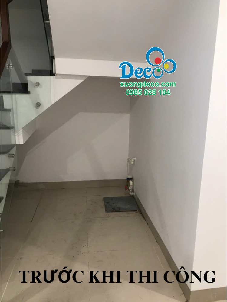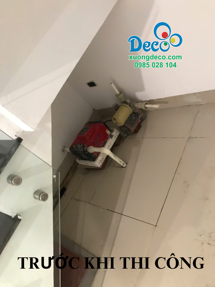 Chị muốn tận dụng vị trí gầm cầu thang để thiết kế tủ giày thế nhưng ở vị trí này có máy bơm khiến chị không biết xử lý như thế nào để thiết kế tủ giày.
