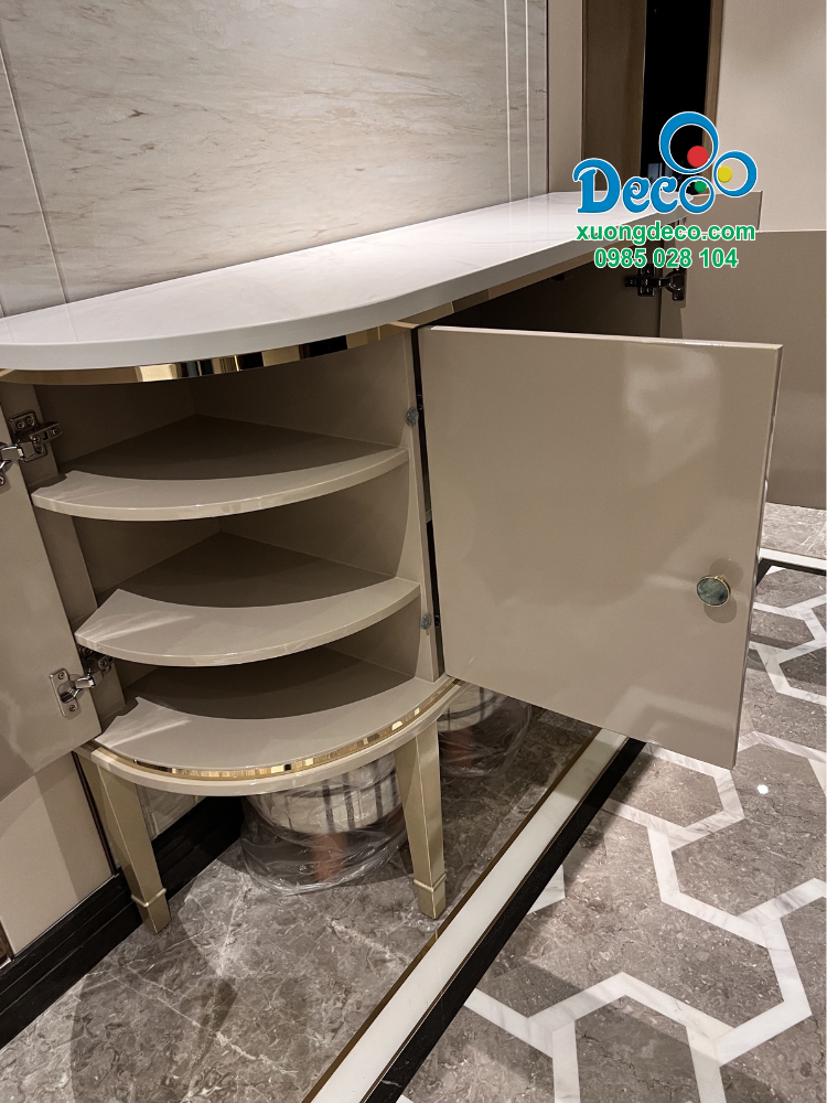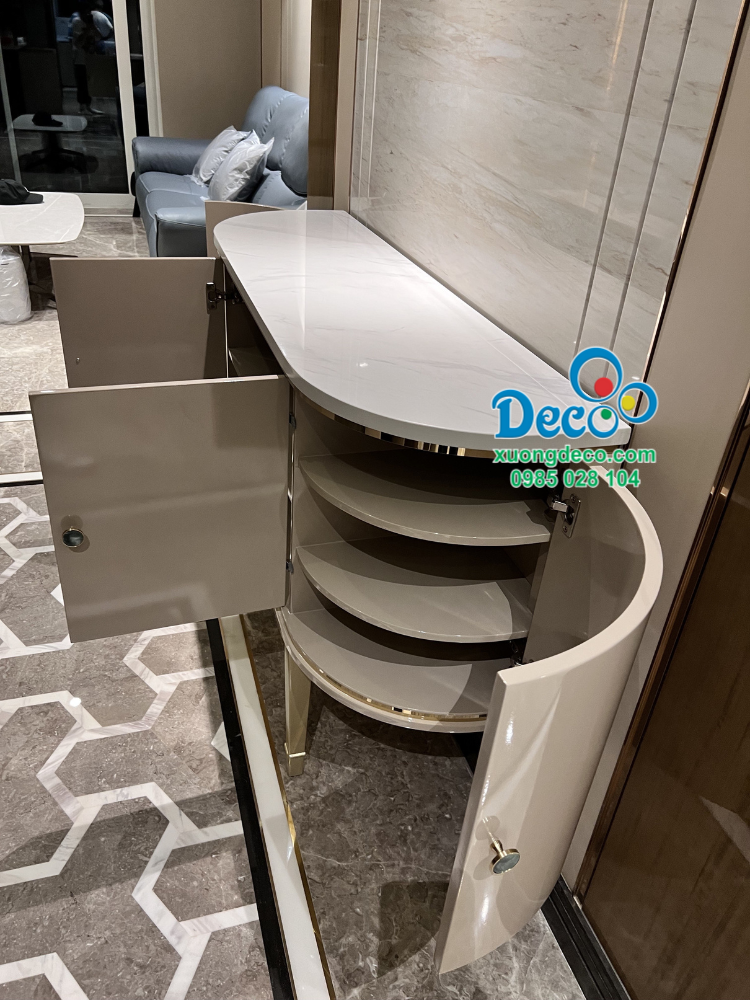 Thiết kế cánh cong không chỉ tạo điểm nhấn độc đáo về mặt thẩm mỹ mà còn giúp tổng thể tủ trở nên nhẹ nhàng, uyển chuyển, phá vỡ sự cứng nhắc thường thấy ở các mẫu tủ truyền thống. Bên cạnh yếu tố thẩm mỹ, tủ còn được tối ưu hóa về công năng với khả năng lưu trữ đồ đạc hiệu quả. Các khoang tủ được bố trí thông minh, phù hợp để cất giữ đồ dùng, đồ trang trí hoặc các vật dụng cá nhân thường dùng khi ra vào nhà.