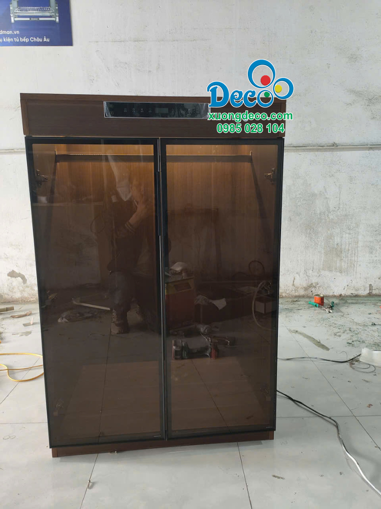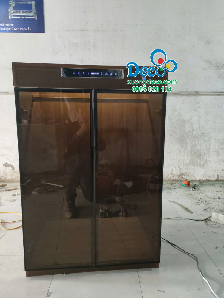 - Chất liệu: Thân tủ làm bằng gỗ Plywood kết hợp với cánh tủ làm khung nhôm nhập khẩu mạ anode cùng với kính cường lực 5ly và bên trong tủ có thêm máy sấy.