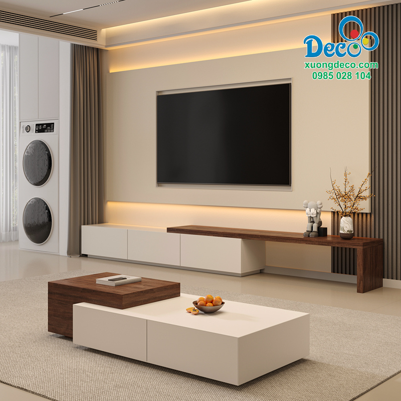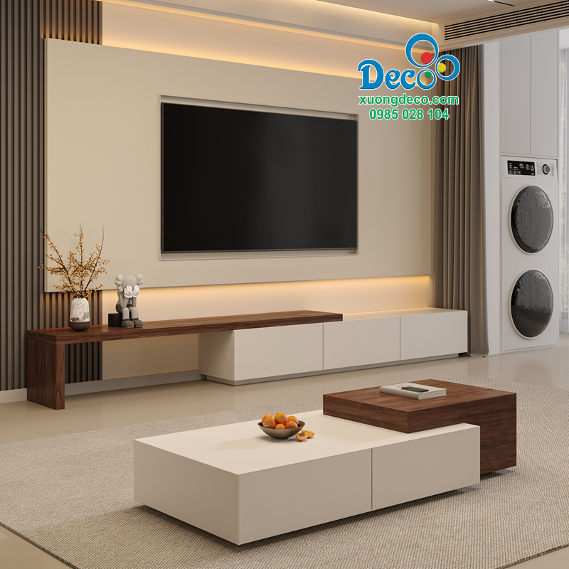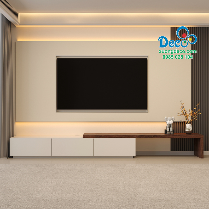 Phần kệ gỗ nổi kéo dài sang bên phải, sử dụng tông màu gỗ nâu trầm tạo sự tương phản tinh tế với nền sáng của vách tivi. Trên mặt kệ bạn có thể bố trí một vài món đồ trang trí như bình gốm dáng nghệ thuật, sách hoặc vật dụng nhỏ tạo nên sự hài hòa, góp phần thể hiện gu thẩm mỹ cá nhân của gia chủ.